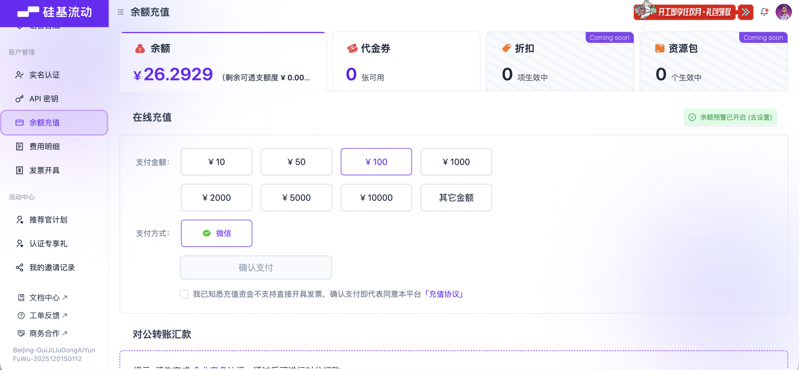 完成后在左侧导航栏找到「余额充值」,根据需要充值金额。