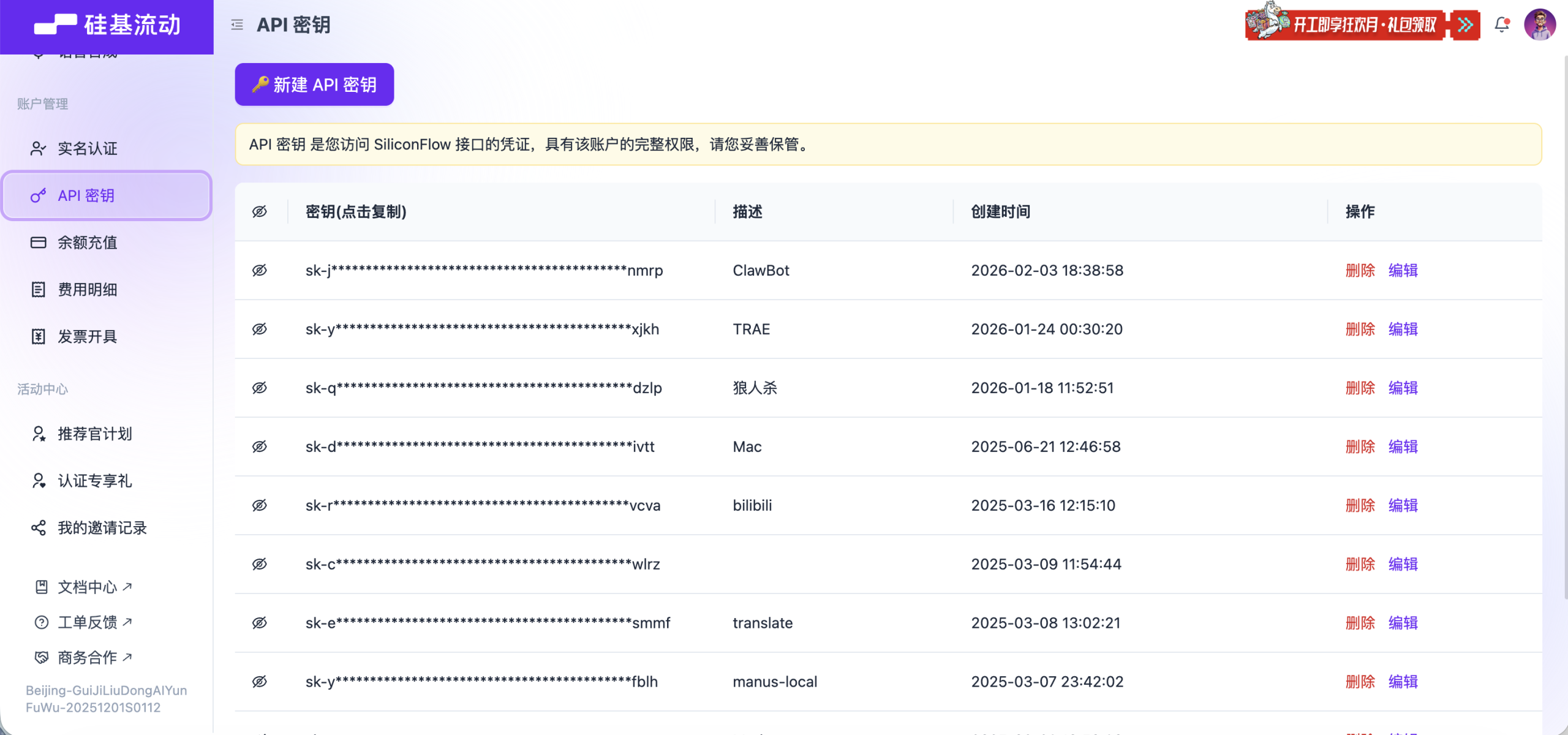 点击「新建API密钥」,自行保管好自己的API密钥,避免泄漏。