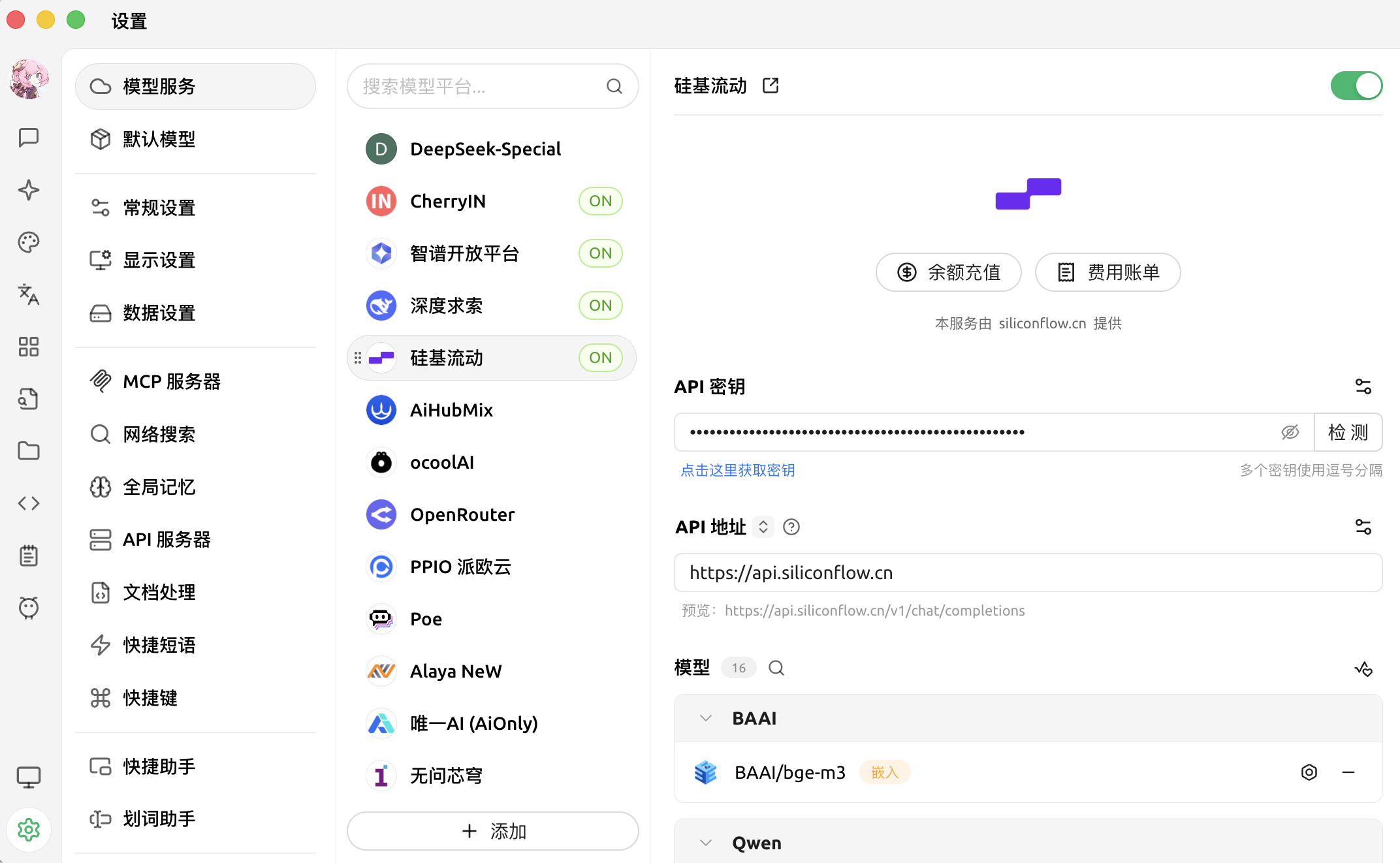 点击「硅基流动」,粘贴你的API Key到API密钥栏中,点击「检测」,随便选择一个模型进行测试,待测试成功后进行下一步