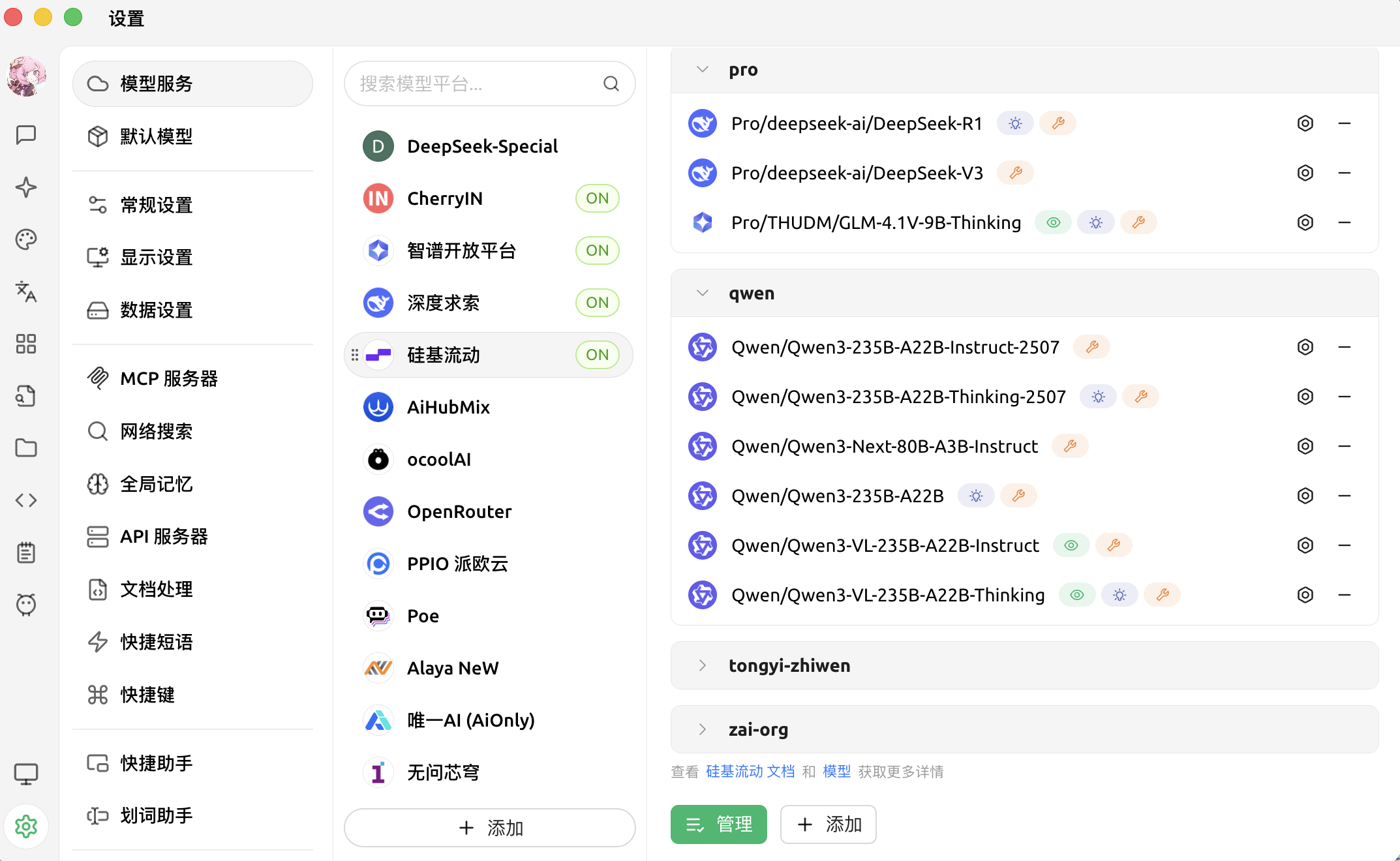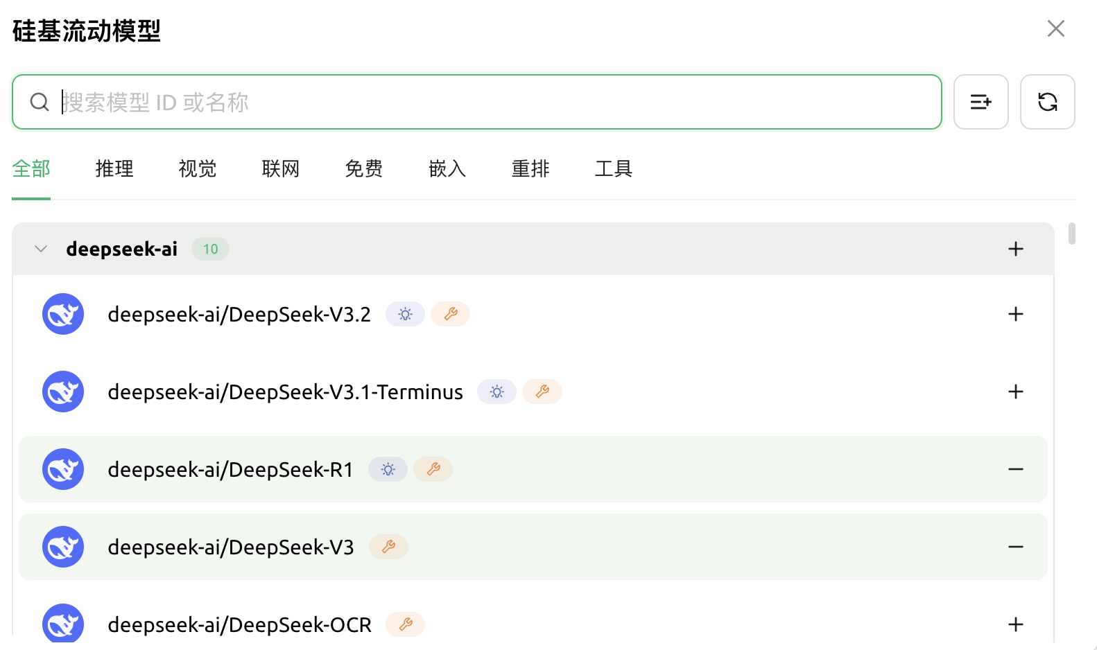 完成后在下方选择你想要使用的模型,点击模型右侧的「+」号,完成后关闭这个页面
