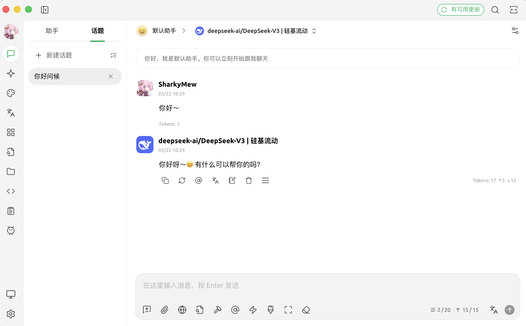 选择左侧导航栏中的对话气泡,来到对话页面,点击「话题」进入聊天界面,并尝试对话,若前面的配置没有问题,这里应当一切正常